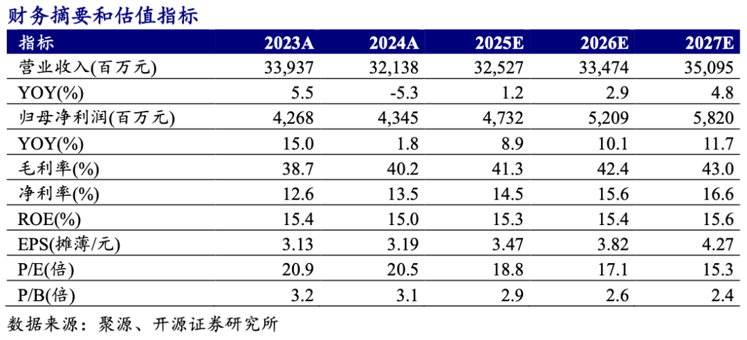 2025Q1-Q3公司营收293.7亿元,同比+1.41%;扣非前后归母净利润52.7、49.2亿元,同比+5.70%、+5.03%。2025Q3公司营收88.8亿元,同比-0.17%;扣非前后归母净利润13.7、12.9亿元,同比+1.62%、+2.41%。需求疲软导致公司收入和利润继续承压,我们下调2025-2027年归母净利润预测至47.32/52.09/58.20亿元(前次48.30/53.16/59.36亿元),对应2025-2027年EPS 3.47/3.82/4.27元,当前股价对应18.8/17.1/15.3倍PE,当前估值低位,需求有望展现韧性,维持“增持”评级。