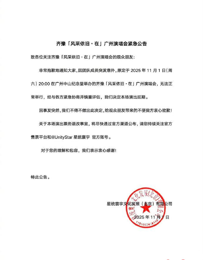 因为屠颖的突然离世,目前广州齐豫演唱会官方已经发布紧急公告,表示团队成员突发意外,演唱会延期。