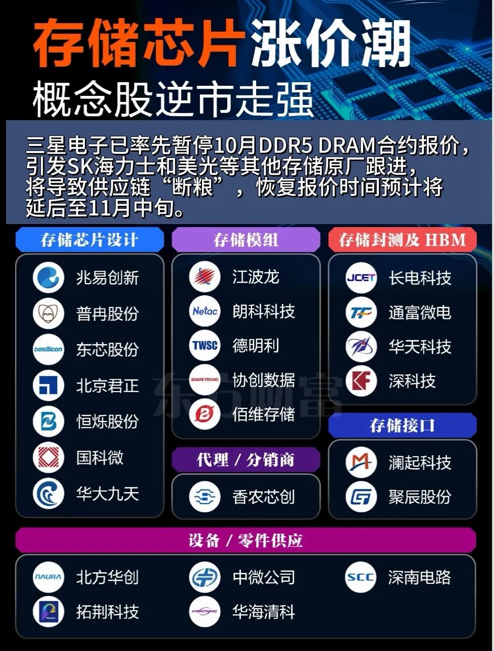 故事要从三星电子说起。据可靠消息,三星电子在存储市场投下了一枚“重磅炸弹”——率先暂停10月DDR5 DRAM合约报价。这一举措犹如一声惊雷,瞬间打破了市场的平静。三星直接告知下游客户“无货可卖”,并且恢复报价的时间预计要延后至11月中旬。这一消息如同导火索,迅速点燃了市场的紧张情绪。
